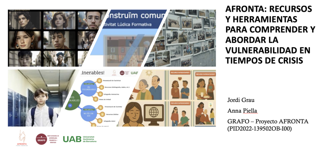 - Afronta: recursos y herramientas para comprender y abordar la vulnerabilidad en tiempos de crisis. Seminario abierto del GRAFO-UAB. 21 de enero de 2026, Sala d’Actes, Facultad de Filosofía y Letras. 16 h. Investigadores del proyecto: Jorge Grau y Anna Piella .