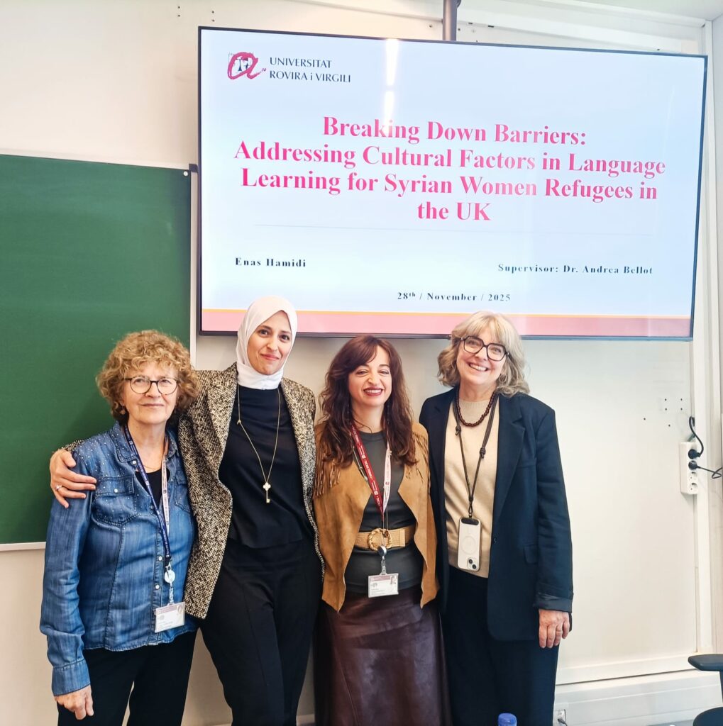 We are happy to announce the successful defence of Enas Talib Farid Hamidi’s doctoral thesis, “Breaking Down Barriers: Addressing Cultural Factors in Language Learning for Syrian Women Refugees in the UK,” presented in the Doctoral Programme in Humanistic Studies at the Universitat Rovira i Virgili (Tarragona).