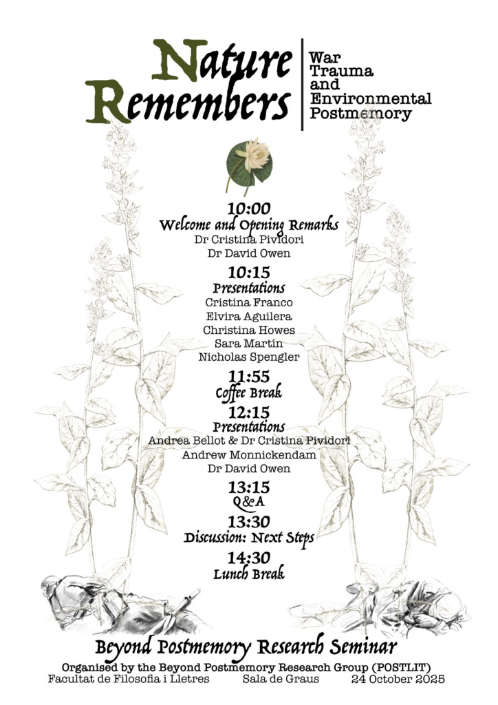 Poster designed by Hugo Palomino to promote the Beyond Postmemory Research Seminar “Nature Remembers” held on 24 October 2025