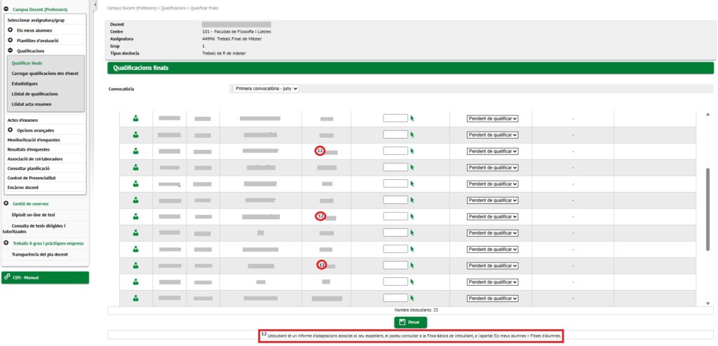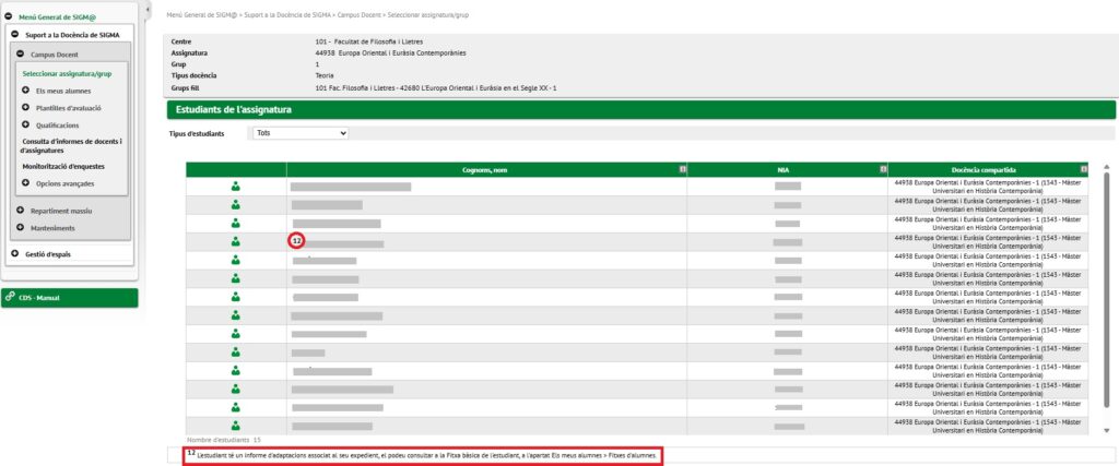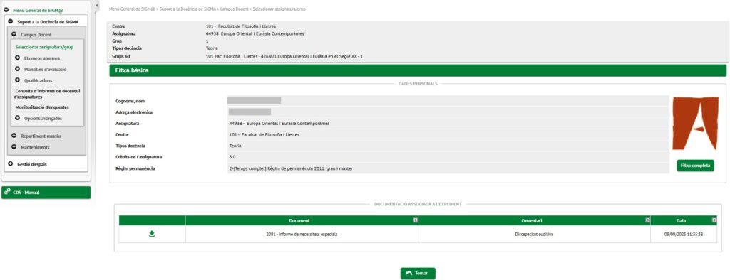 12 L’estudiant té un informe d’adaptacions associat al seu expedient, el podeu consultar a la Fitxa bàsica de l’estudiant, a l’apartat Els meus alumnes > Fitxes d’alumnes.
