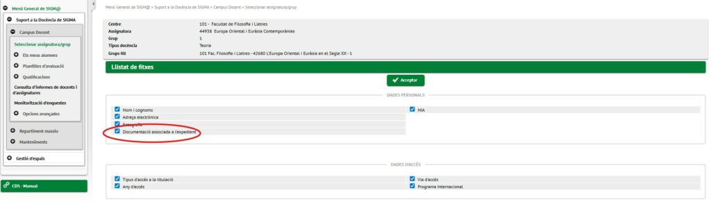 Des de la fitxa bàsica podem accedir a la fitxa completa, aquesta opció generarà un llistat amb la informació de l’estudiant. Haurem de seleccionar la casella corresponent a “Documentació associada a l’expedient”