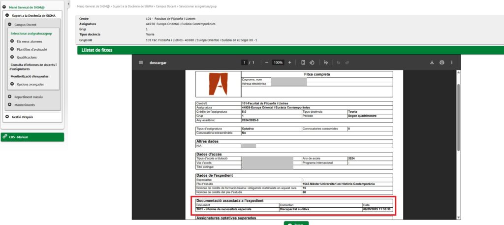 A partir del curs 2025-26 al Campus Docent Sigm@ hi trobareu identificats els i les estudiants amb necessitats educatives específiques i, en cada cas, podreu accedir a l’informe d’adaptacions elaborat pel Servei d’Igualtat i Diversitat (SIDi).