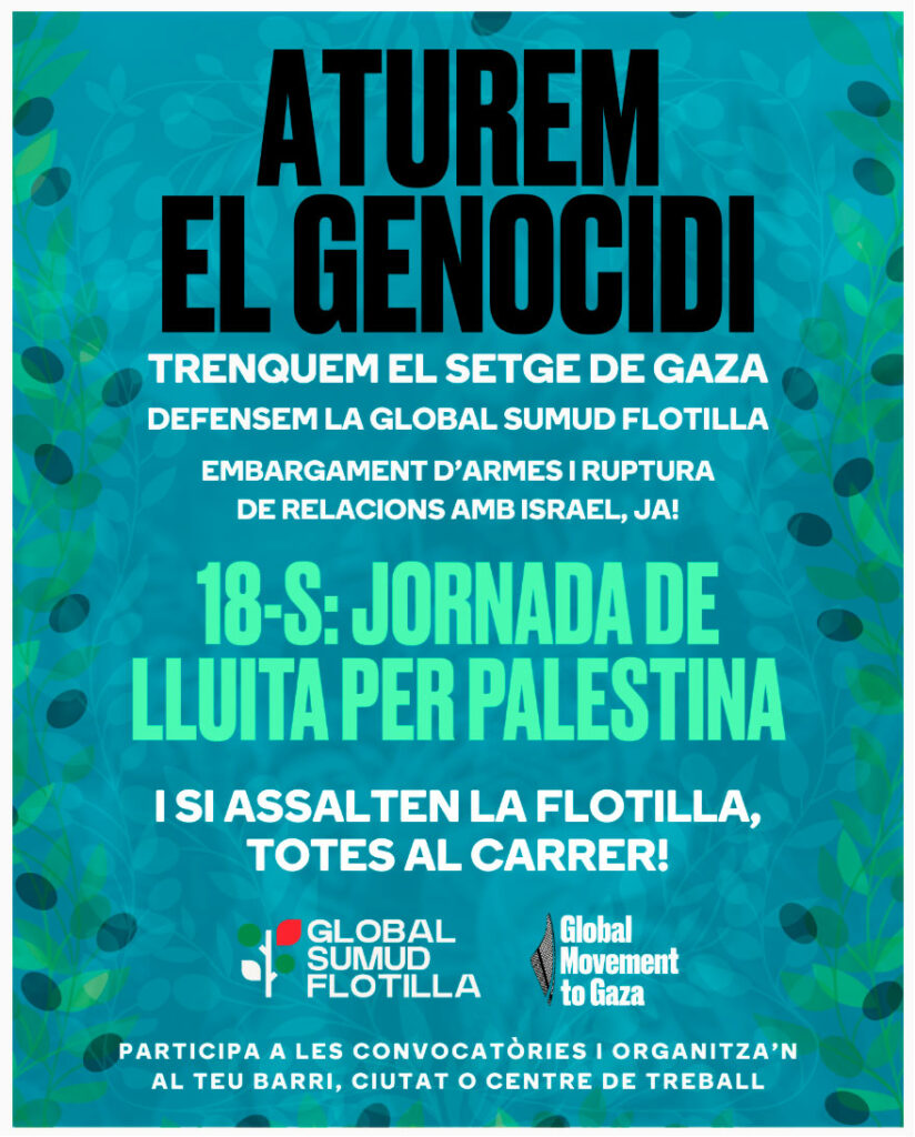 D’aquesta manera ens preparem cap a la gran mobilització social que tindrà lloc el 4 d’octubre a les 12h amb sortida als Jardinets de Gràcia de Barcelona amb el lema “Fi al comerç d’armes i a les relacions amb Israel”.