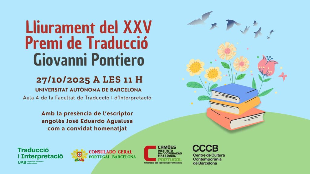 El Centro de Língua Portuguesa / Camões, I.P. i la Facultat de Traducció i d’Interpretació de la Universitat Autònoma de Barcelona el/la conviden al lliurament del XXV Premi de Traducció Giovanni Pontiero (edició de 2025) el dia 27 d’octubre de 2025 a les 11 h.