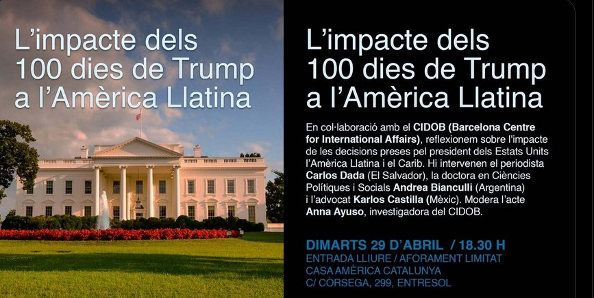 One hundred days after the start of his second term, Casa Amèrica Catalunya and CIDOB organized a debate on 29 April on the impact of the decisions taken by the President of the United States Donald Trump in Latin America and the Caribbean with Carlos Dada, Andrea Bianculli and Karlos Castilla, moderated by Anna Ayuso, member of GLOBAL INTEL.