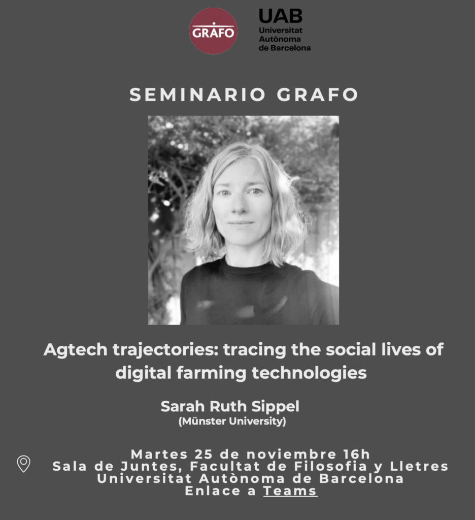 - November 25th, 2025. Agtech trajectories: tracing the social lives of digital farming technologies. Sarah Sippel (Münster University). Sala de Juntes, Facultat de Filosofia i Lletres. 16 h. Hybrid session.