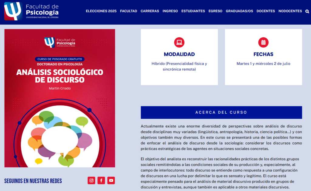 Una de las actividades realizada por el Prof. Martín Criado fue el Curso gratuito de Postgrado «Análisis sociológico del Discurso» autorizado por RD-2025-701-E-UNC-DEC#FP. Participaron de esta instancia 45 personas.