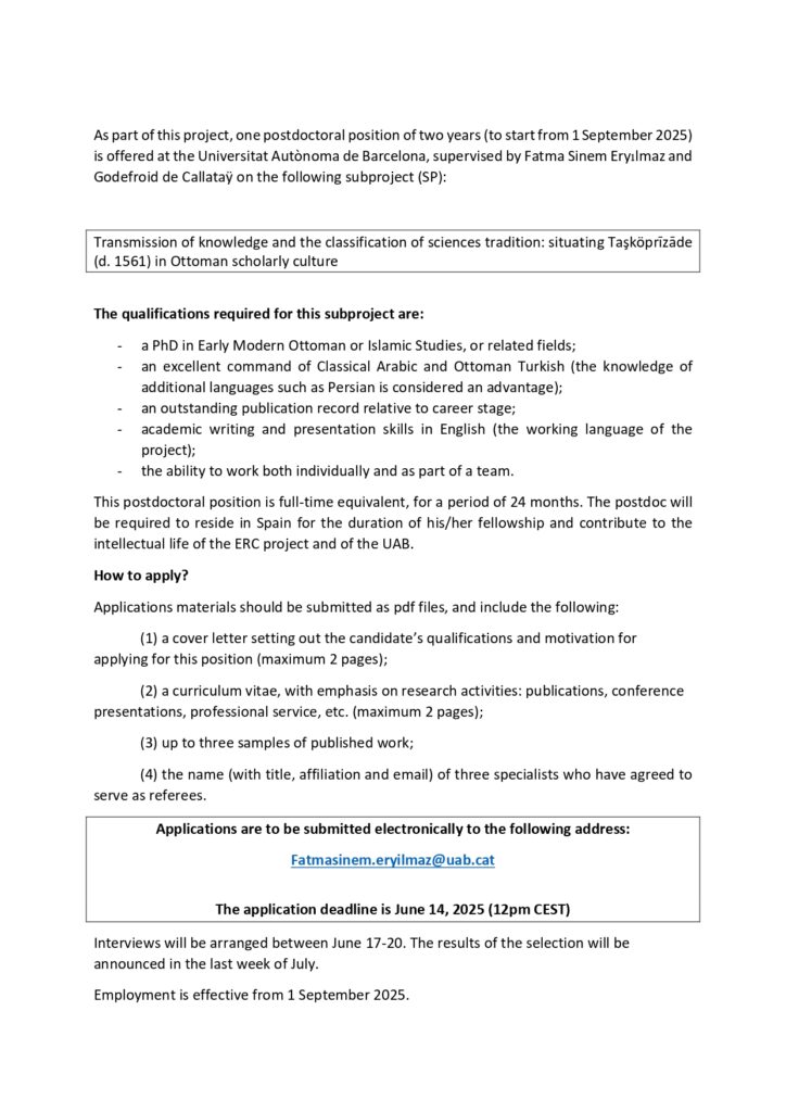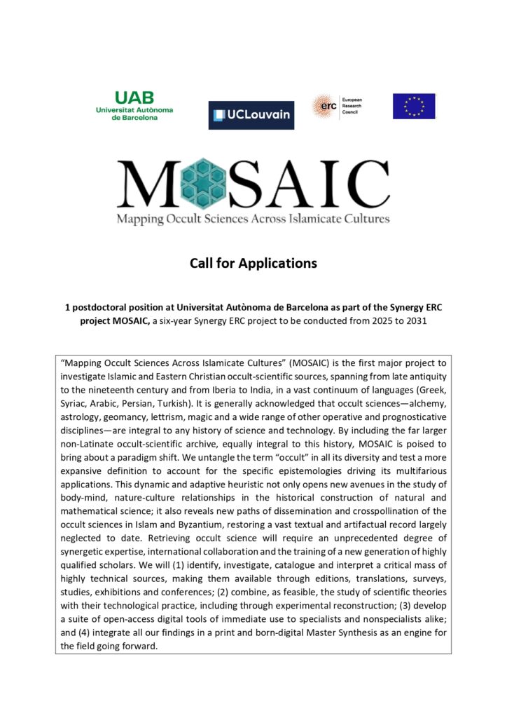 Difundimos la siguiente convocatoria para un contrato post-doctoral en la Universitat Autònoma de Barcelona en el marco del proyecto Mapping Occult Sciences Across Islamicate Cultures (MOSAIC).