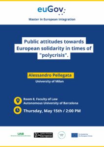 - Public attitudes towards European solidarity in times of ‘polycrisis’📢 Próxima conferencia en el marco del Máster en Integración Europea (euGov – UAB) El próximo jueves 15 de mayo a las 14:00 h, tendremos el placer de recibir al… Més informació: Public attitudes towards European solidarity in times of ‘polycrisis’