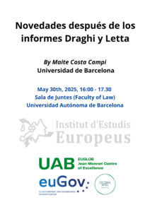 - Novedades después de los informes Draghi y Letta🗣️ Por Maite Costa Campi (Universidad de Barcelona)📍 Sala de Juntes, Facultad de Derecho – Universitat Autònoma de Barcelona🕓 De 16:00 a 17:30h En los últimos meses, los informes elaborados… Més informació: Novedades después de los informes Draghi y Letta