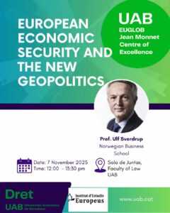 - Seminar “European Economic Security and the New Geopolitics”Speaker: Prof. Ulf Sverdrup (Norwegian Business School)Date & time: 7 November 2025, 12:00–13:30Venue: Sala de Juntas, Faculty of Law, Universitat Autònoma de Barcelona (UAB)Organised by: UAB EUGLOB – Jean Monnet… Més informació: Seminar “European Economic Security and the New Geopolitics”