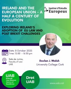 - Seminar on Ireland & the EU: Half a Century of EvolutionWe are delighted to host Prof. Declan J. Walsh (University College Cork) for a conference on:“Ireland and the European Union – A Half a Century of Evolution: Exploring Ireland’s Adoption… Més informació: Seminar on Ireland & the EU: Half a Century of Evolution