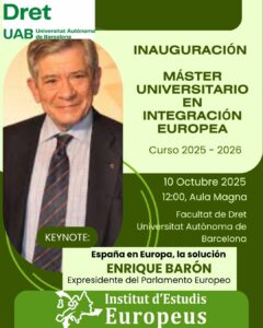 - “España en Europa, la solución”, conferència inaugural MUIE d’Enrique BarónAquest any, en el marc del 40è aniversari del procés d’adhesió d’Espanya a les Comunitats Europees (1985–1986), tenim l’honor de rebre a Enrique Barón, expresident del Parlament Europeu, per inaugurar… Més informació: “España en Europa, la solución”, conferència inaugural MUIE d’Enrique Barón