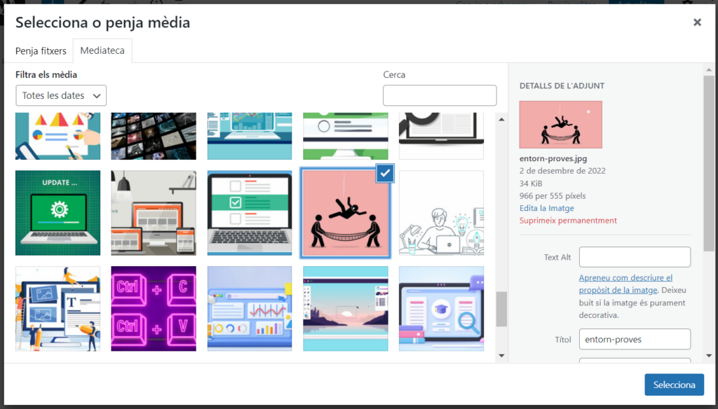 En afegir una imatge al bloc, apareixen les opcions del bloc:
