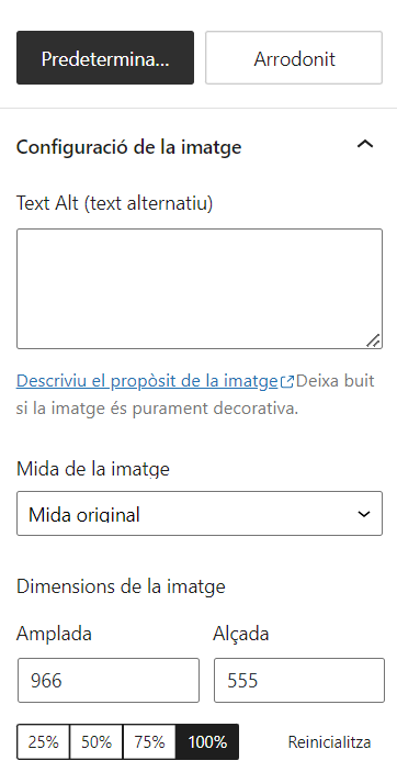 En seleccionar el bloc d’imatge, apareixen les opcions de configuració: