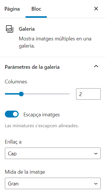 En seleccionar el bloc galeria, a la barra lateral es mostren les opcions de configuració: