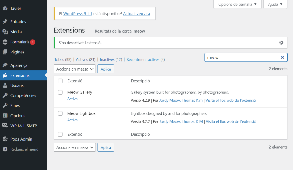 Per tal de poder utilitzar aquest tipus de bloc, cal activar abans els plugins Meow Gallery i Meow Lightbox. Per fer-ho, aneu a l’adminsitració del vostre site, a l’apartat extensions.