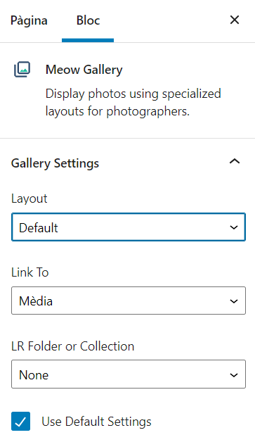 En seleccionar el bloc, podeu veure les opcions del bloc de galeria Meow: