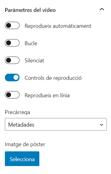 En seleccionar el bloc vídeo, la barra lateral mostra les opciones de configuració: