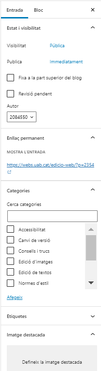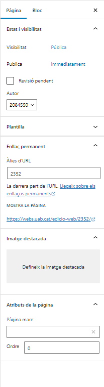 - Permalink: Permet configurar l’adreça permanent de la pàgina o entrada que permet enllaçar-la des d’una altra pàgina, correu electrònic o xarxa social. En desar la pàgina o entrada, aquest camp s’omple automàticament amb una versió amigable del títol, que podeu modificar editant-lo.