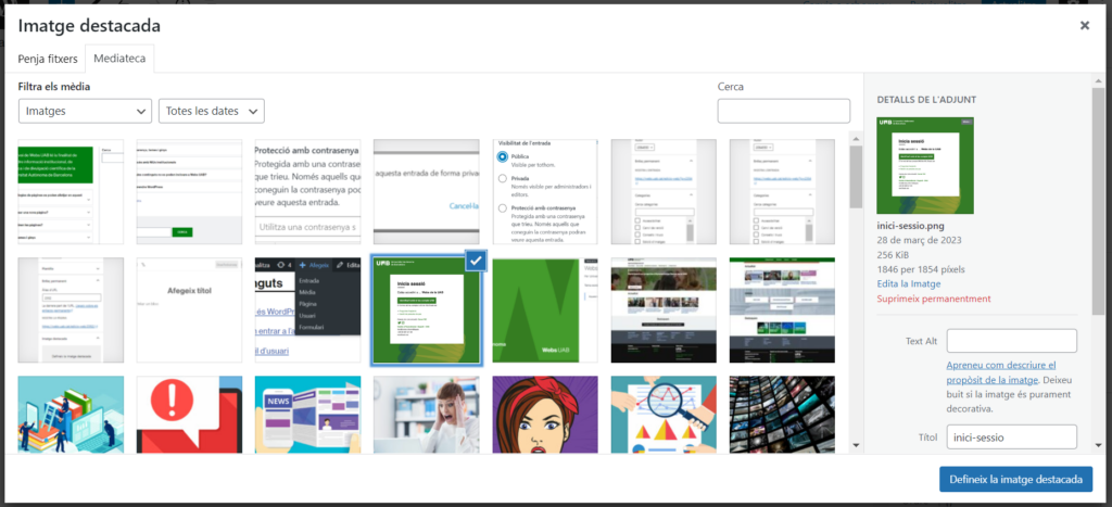 Mostra la imatge que seleccioneu a l’inici de la pàgina o entrada. Per seleccionar la imatge, premeu la zona grisa “defineix la imatge destacada” de la barra lateral de configuració. S’obrirà una finestra emergent amb les imatges de la mediateca del web i l’opció de carregar-ne una de nova.