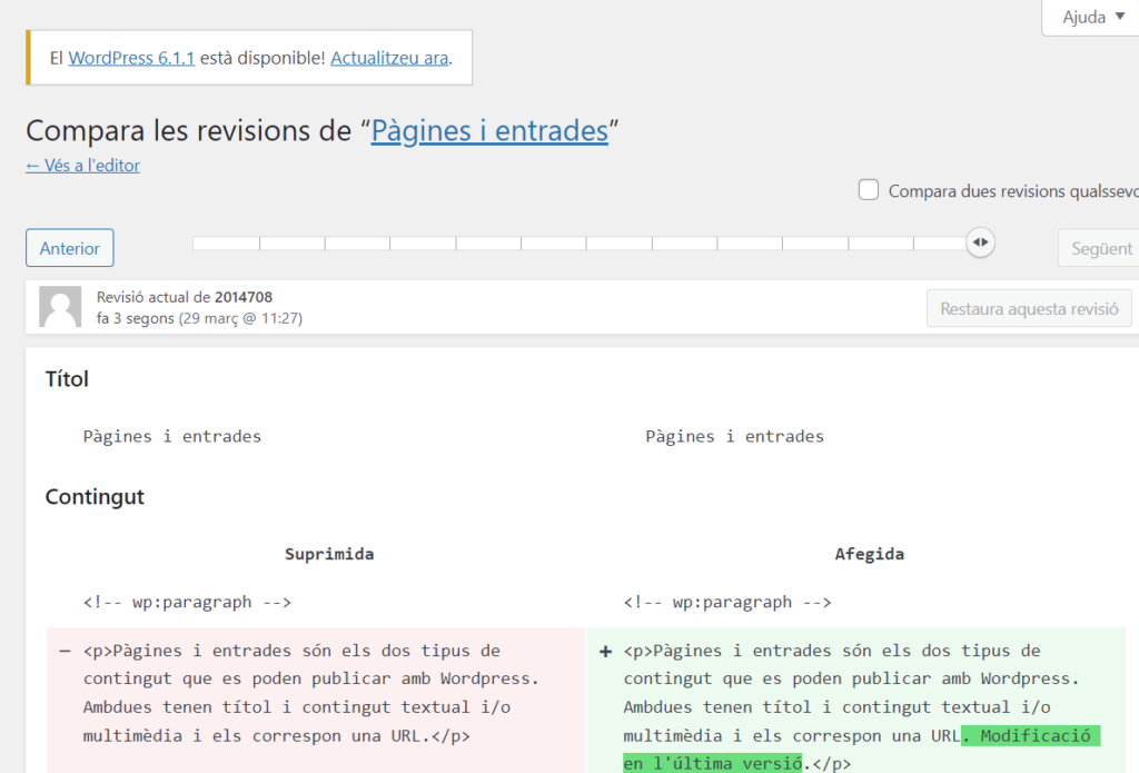 Aquesta opció permet comparar les versions desades de la pàgina o entrada i tornar a qualsevol d’elles.
