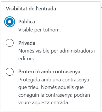 Controla qui pot veure la pàgina o entrada un cop s’ha publicat. Prement l’opció predeterminada, s’obre un panell emergent on es pot modificar.