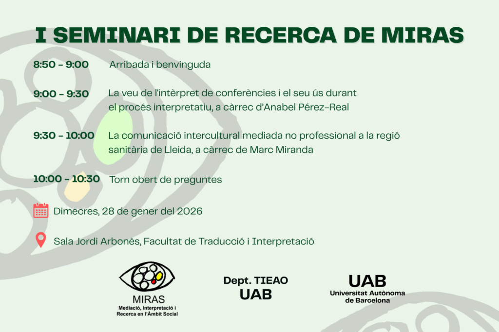 El proper 28 de gener, el grup de recerca MIRAS farà un Seminari de Recerca a la Sala Jordi Arbonès de la Facultat de Traducció i Interpretació. Aquest seminari s’ha concebut com un espai de trobada entre els membres del grup perquè comparteixin i debatin sobre la seva recerca amb altres companys d’investigació.