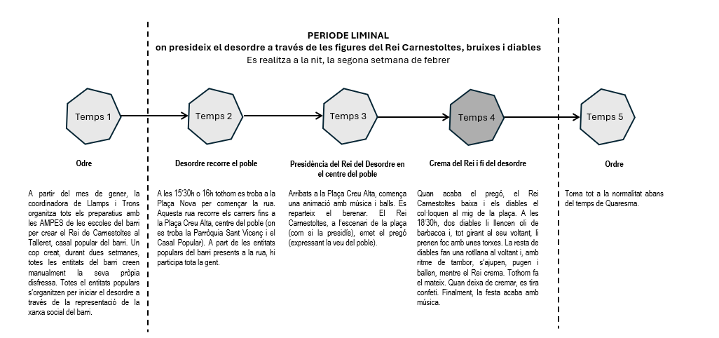 Un apunt final sobre la noció de desordre. En aquest sentit, és interessant veure com gran part d’aquest desordre és canalitzat o expressat a través de la música i dels diferents actors que intervenen en el ritual. Així, el paper de les batucades repartides en diferents punts de la rua és destacable, ja que són expressions musicals de reivindicació i de denúncia de les injustícies socials. La rua és un dels elements principals del ritual, amb les figures dels dimonis, les bruixes i éssers de la nit, i tota l’expressió popular disfressada que recorre els carrers principals del municipi. El pregó, recitat abans de la crema, té caràcter satíric i polític, mostrant la disconformitat popular. D’aquesta manera, el pregó i la crema de la figura de del Rei Carnestoltes són els dos moments amb una tensió més elevada. El foc, element de purificació, és també un dels símbols principals del ritual, i va acompanyat de la música provinent de les batucades, creant una experiència sensorial molt intensa. Finalment, ja en el Temps 5, un cop cremat el Rei Carnestoltes, la societat es replega tornant a la seva normalitat i restablint-se l’ordre social. El ritual ha permès, però, que el poble governi i s’expressi en aquest temps, alliberant la tensió que, al cap i a la fi, ha disminuït per un període llarg d’un any.