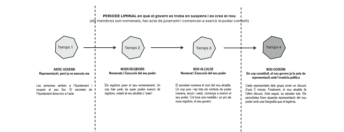 Els següents Temps 2 i 3 formen part d’un període liminal perquè el nou poder encara no està instaurat, cal que en prengui possessió, en nom del poder atorgat pel poble lleidatà a les urnes. Així, doncs, al llarg d’aquesta etapa el poder es troba en suspens, per configurar-se de nou. Aquest es construeix en dos temps diferenciats: