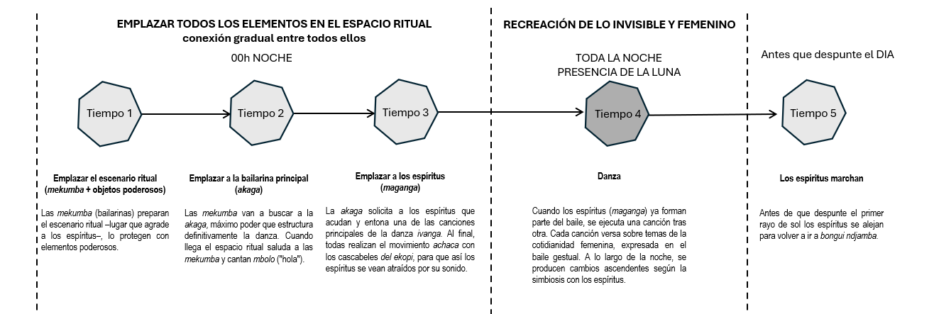 [Tiempo 1] Se prepara el espacio ritual, un lugar que guste a los espíritus, protegido por el árbol ibito con raíces blancas. El espacio ritual reproduce el mundo de los espíritus, a través de los sentidos, atrayéndolos gracias al olor del aceite del vitedi, al gusto o sabor de la planta de la iboga, al sonido de los tambores y a la percepción de la dominancia del blanco, color de los espíritus, con la luna llena (inanga), la pintura corporal blanca (pembe), el árbol ibito (con sus raíces blancas que iluminan bajo tierra) y la lámpara (lambi).