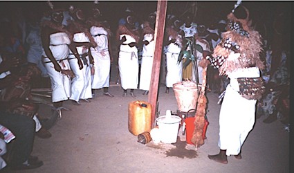 Fons, Virginia (1994). Escenario ritual del ivanga con las bailarinas (mekumba), la akaga en frente y los objetos simbólicos en el centro. [Fotografía]. Pueblo Bomudi, Guinea Ecuatorial.