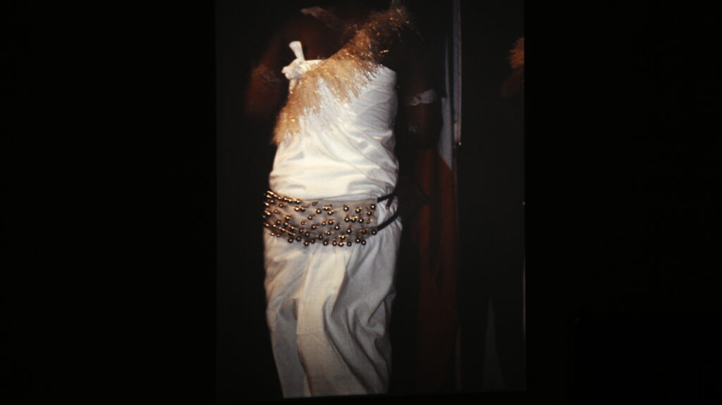 Fons, Virginia (1994). Ekopi con cascabeles que tintinean con el movimiento de baile achaca. [Fotografía]. Actuación de la Asociación Ndowe en Barcelona.