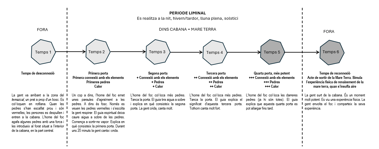 Un període liminal comença quan les persones entren en una nova realitat, la del temazcal —la cabana— que representa la mare-terra, on les accions rituals es van desenvolupant fent referència a una altra temporalitat, la del cicle de la vida. De fet, aquest període està subdividit per quatre temps (del Temps 2 al 5) corresponents a cadascuna de les etapes vitals de la vida, representades per a quatre portes que un ha de travessar: 1) naixement/infantesa; 2) adolescència/joventut; 3) maduresa —considerada una etapa de plenitud—; 4) vellesa —que ja ha integrat tota una trajectòria existencial i de coneixement. És un trànsit simbòlic per la vida, dins la mateixa mare-terra. La veu del guia espiritual és la que orienta també aquest trànsit.