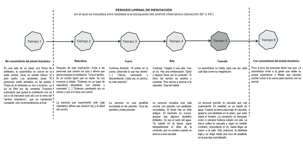 El periodo liminal empieza con los ejercicios de relajación, preparando a los participantes a un estado de conciencia propicio para romper con la propia realidad. Sin embargo, es la voz de la especialista y el ritmo constante del tambor que realmente los induce a experimentar con otra realidad, a visionar otro mundo. Son los elementos conductores que permiten sumergirse en el mundo inferior, incluso modificando el compás del tiempo, que se ralentiza (y no parece durar sólo 40 minutos). La voz y su narrativa los conduce a espacios simbólicos clave (naturaleza, cueva, sala y cascada), que transitan y provocan que la experiencia sea efectiva. En realidad, estos espacios denotan que el viaje cada vez se sumerge más en las profundidades. Algunos enlaces (por ejemplo, el túnel, el río o la barca) permiten transitar entre estos espacios hasta llegar a lo más profundo. Es en este lugar, en el fondo mismo, con el agua en movimiento de la cascada, cuando surge la visión más significativa e interiorizada del animal de poder. En este sentido, la cascada puede ser entendida no sólo como un espacio al que se llega finalmente, sino un lugar en el que el propio movimiento del agua se convierte en el elemento primordial que transporta el animal hasta la persona.