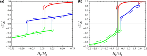 component of the normalised magnetisation during the hysteresis loop. The plot demonstrates de possibility (and the protocol needed) to change from one state to the other two.