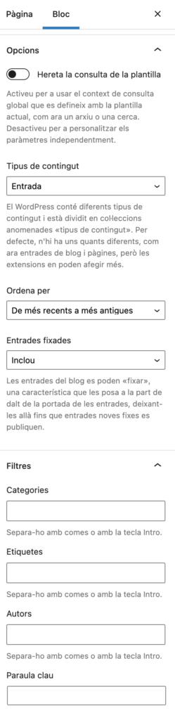 Posteriorment, podeu configurar aquest bloc amb les opcions de configuració de la barra lateral dreta. Tria del tipus de contingut que es mostra (pàgina, entrada o tipus de contingut personalitzat si en teniu), ordenació per data ascendent o descendent i filtrat per categoria, etqueta, autors o paraules clau.