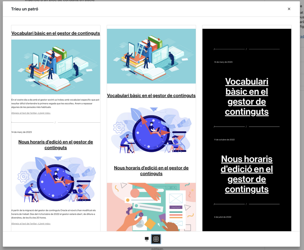 Per a la visualització del resultat de la consulta, podeu triar un dels patrons predeterminats anant a l’opció Tria en inserir el bloc. Aquests patrons permeten visualitzar les entrades resultants de la consulta mostrant una combinació de tíol de l’entrada, entradeta, imatge destacada i data. Seleccioneu la que preferiu utilitzar per inserir el bloc.
