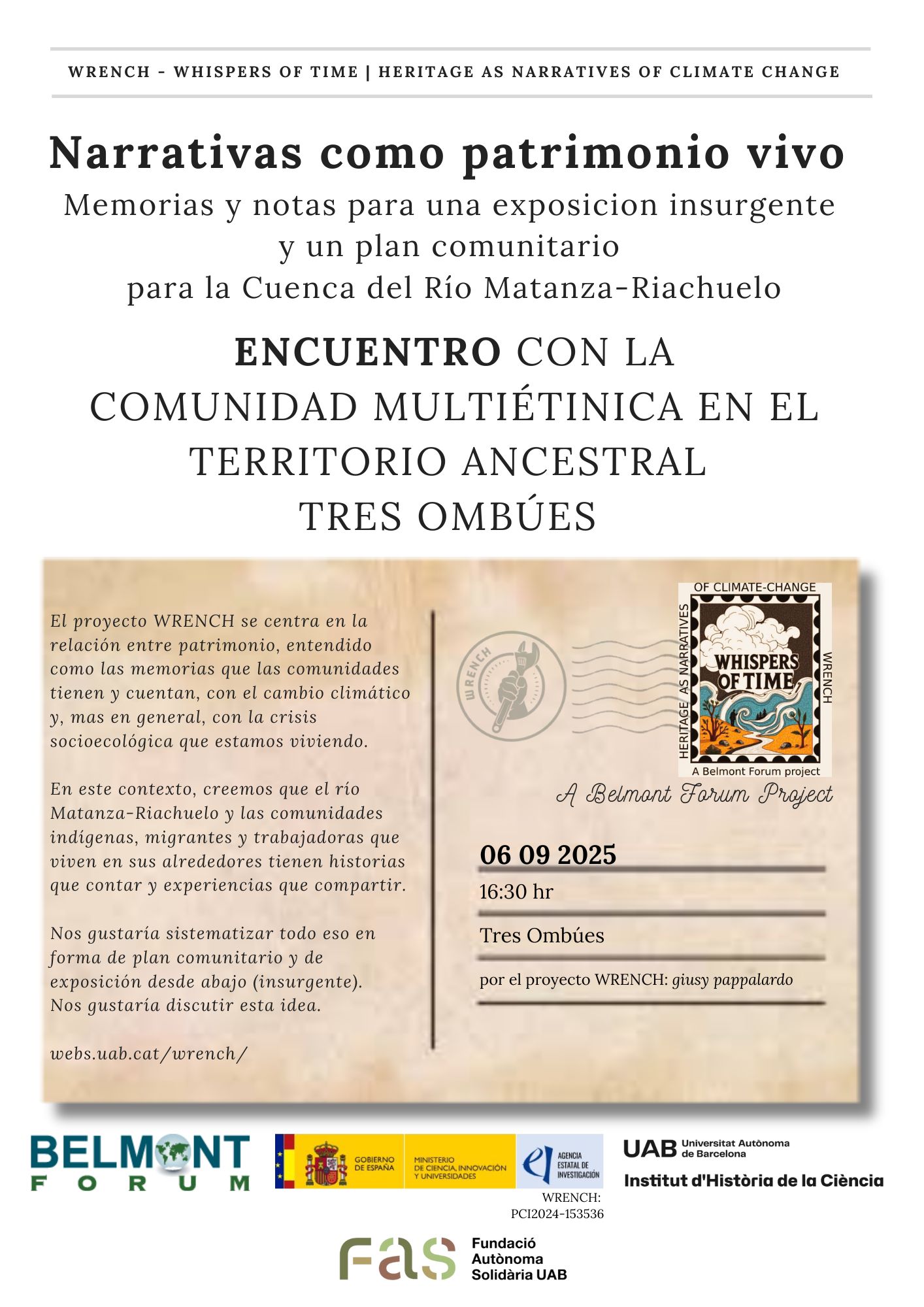 Within the framework of the WRENCH project and the programme “Narratives as Living Heritage in the Matanza–Riachuelo Basin,” supported by the Fundació Autònoma Solidària of the UAB, we met on September 6th, 2025 to listen to the voices of the multi‑ethnic Indigenous communities at the ancestral site of Tres Ombúes, on the banks of the Matanza–Riachuelo River (Partido de La Matanza).