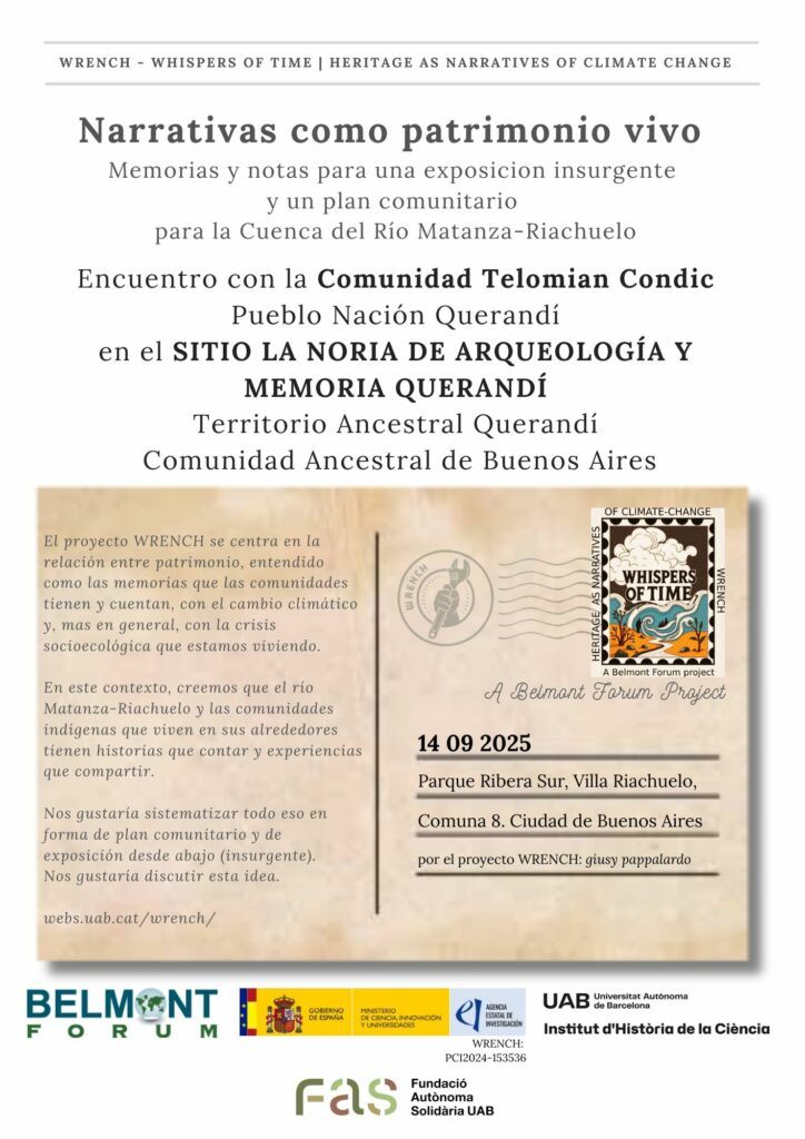 Within the framework of the WRENCH project and the programme “Narratives as Living Heritage in the Matanza–Riachuelo Basin,” supported by the Fundació Autònoma Solidària of the UAB, a gathering was held on 14 September 2025 to listen to the voices of the Telomian Condic Querandí Nation Community. The meeting took place at the La Noria Site of Querandí Archaeology and Memory, a location where a stretch of the old, unchannelled Matanza–Riachuelo River still flows and native tala trees continue to grow. This landscape remains a symbolic and culturally significant place for the Querandí people.
