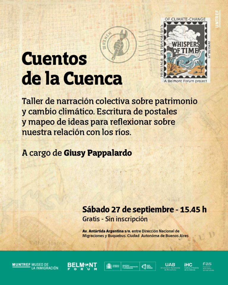Within the framework of the WRENCH project and the programme “Narratives as Living Heritage in the Matanza–Riachuelo Basin,” supported by the Fundació Autònoma Solidària of the UAB, the workshop “Stories of the Basin – Collective Storytelling on Heritage and Climate Change” took place on September 27th, 2025. The workshop invited participants to listen to stories connected to the surroundings of the Matanza–Riachuelo Basin and to map them as a way to reflect on our relationship with the rivers. A special contribution was offered by Amarí Carla Gorbalán, artist and researcher of the Querandí Nation People, who shared a reflection on the ancestral cosmovision of the territory. The workshop is part of the Series of Conversations and Collective Storytelling Workshops at MUNTREF Museo de la Inmigración.